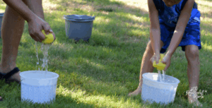 A sponge relay race is a fun water-based game where teams compete to fill an empty container by using sponges to transfer water from a full container. Players take turns dipping a sponge into a bucket of water, running to an empty bucket, and squeezing the water out. The team that fills their bucket first wins.